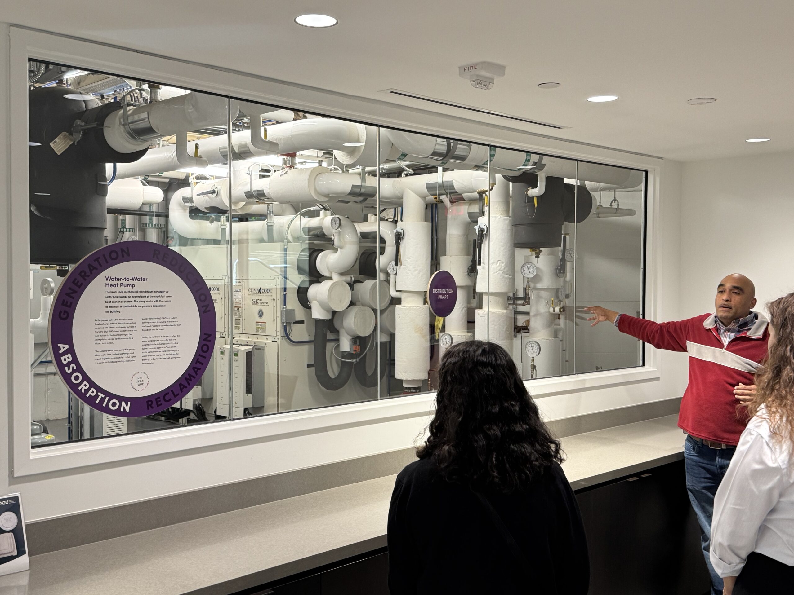 During the tour, AGU representatives spoke to how the project’s design team conducted a cost-benefit analysis comparing several retrofit scenarios. Ultimately, they found that an ambitious clean energy package, including a cutting-edge wastewater heat exchange system, would pay off over the long term through operational savings.