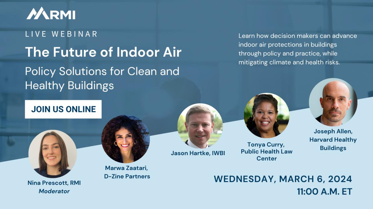 RMI will host a virtual panel discussion on March 6th, 2024 at 11am ET, summarizing their recent report and convening industry experts to illuminate why now is the ideal time to improve indoor air and what policy solutions are available to deploy. They’ll also answer key questions about indoor air pollution and building performance, including those from audience members.