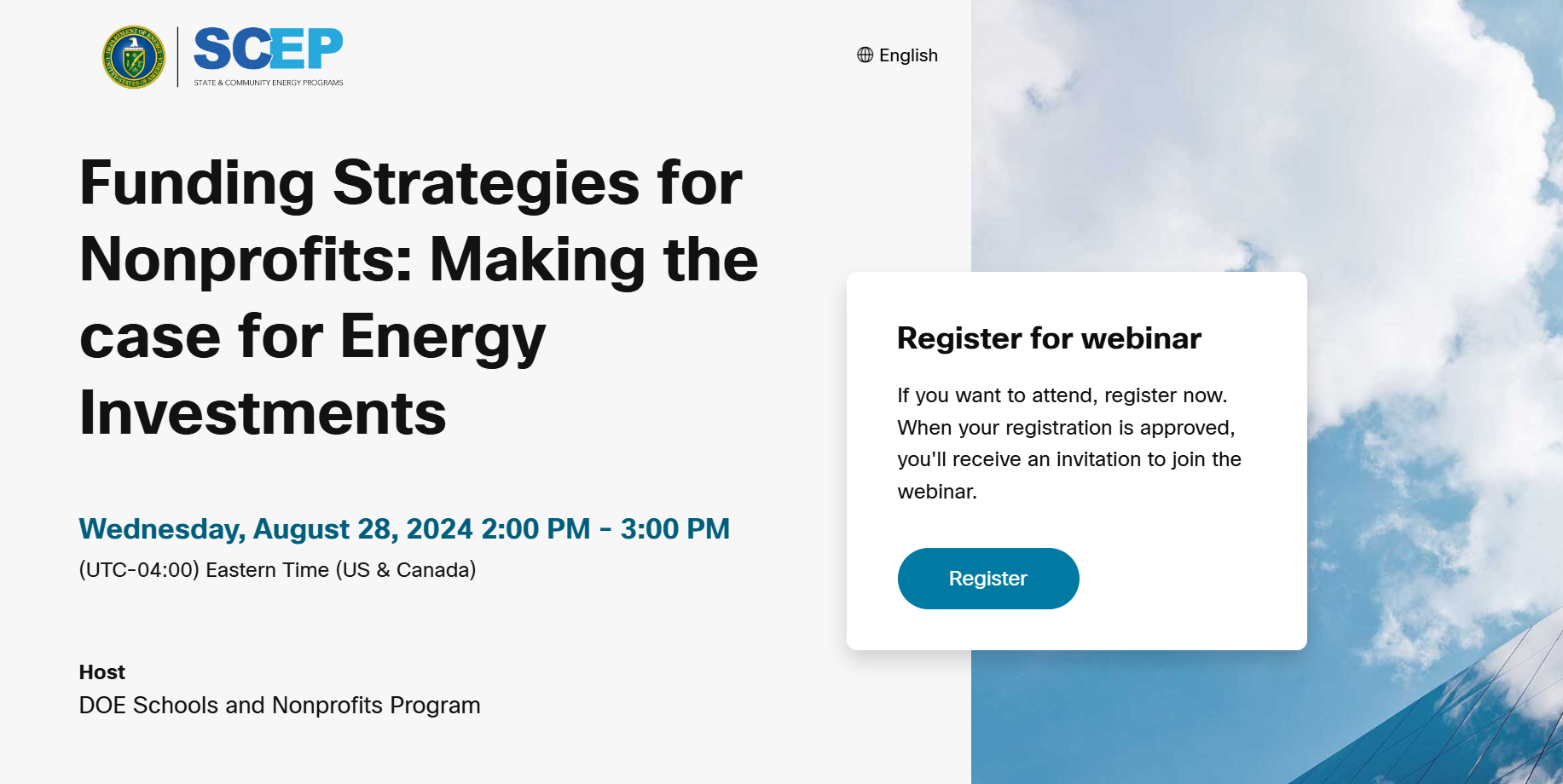 Join the DOE Office of State and Community Energy Program (SCEP) and the Renew America’s Nonprofits on Wednesday, August 28th at 2pm ET for the first webinar in a series designed to help nonprofits make the case to funders for energy efficiency upgrades and clean energy improvements.