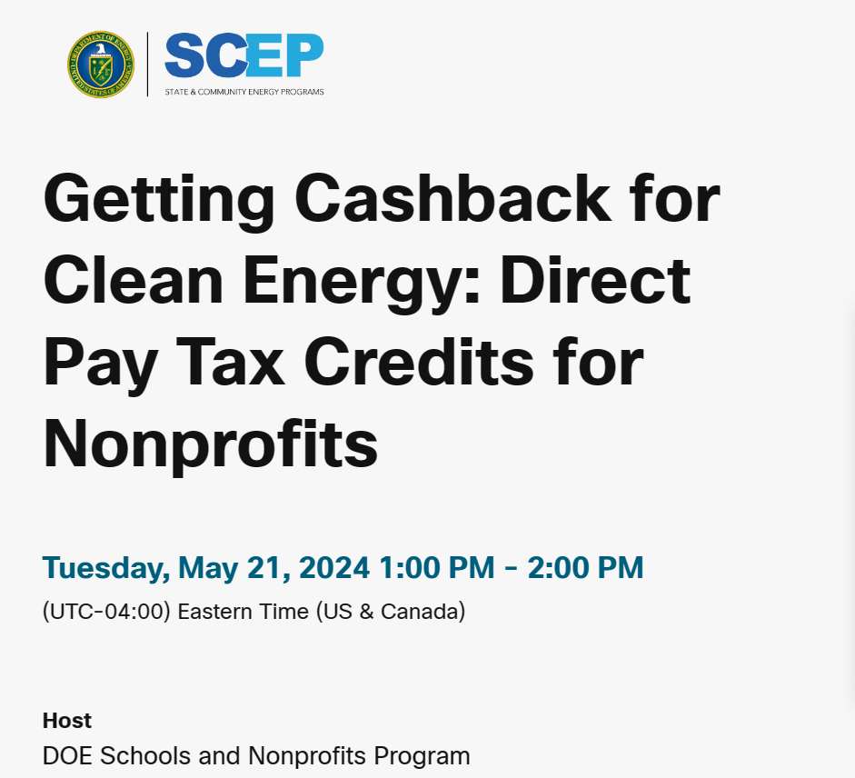 The DOE Renew America’s Nonprofits Program is hosting a webinar Tuesday, May 21 at 1PM ET highlighting a new funding opportunity: Elective Pay (also called “direct pay”).