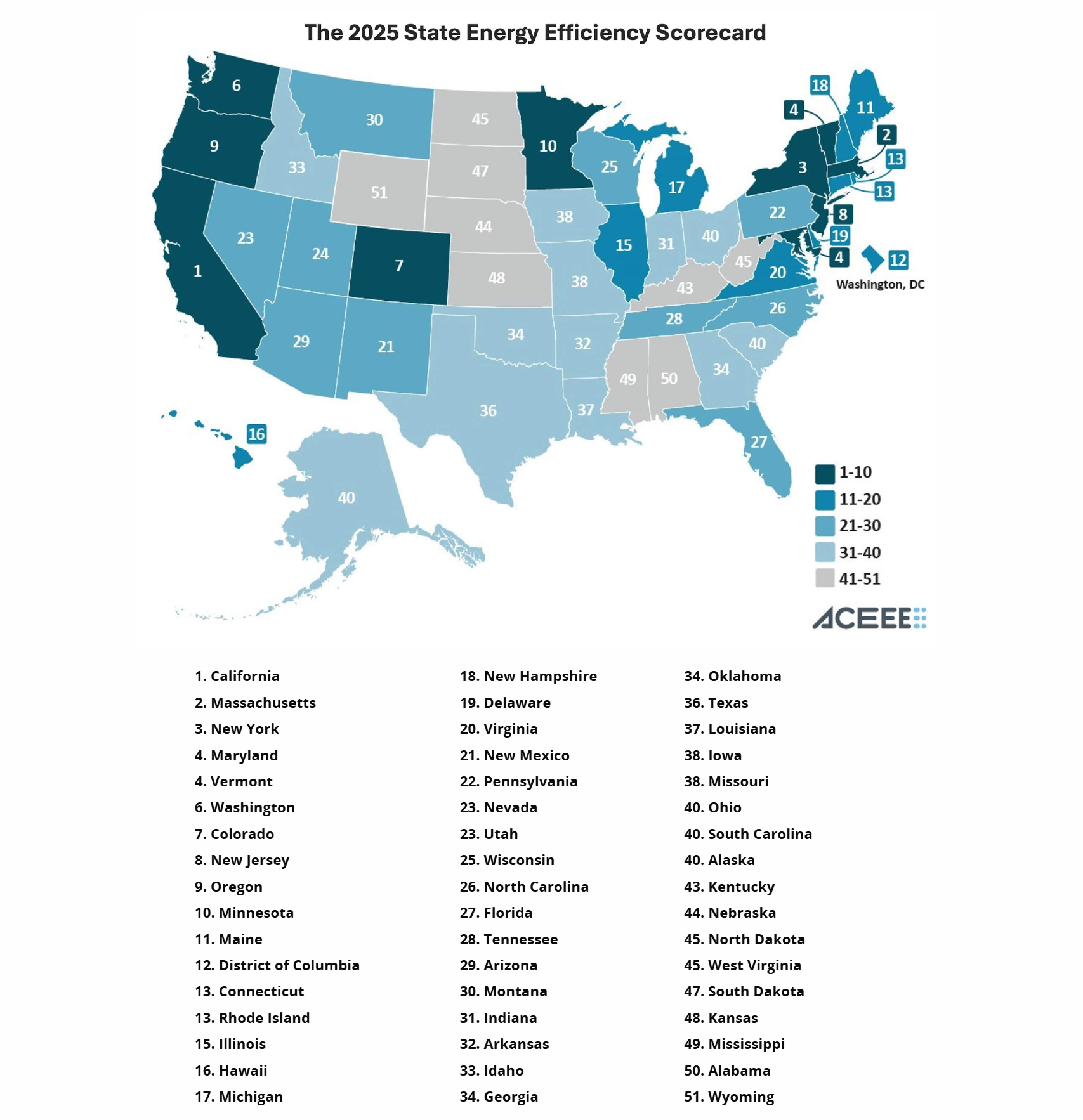 The top finishers in the 2025 scorecard are California, Massachusetts, and New York, with Maryland and Vermont tied for fourth place. Colorado, Louisiana, and New Jersey are among the most improved states since the last scorecard.