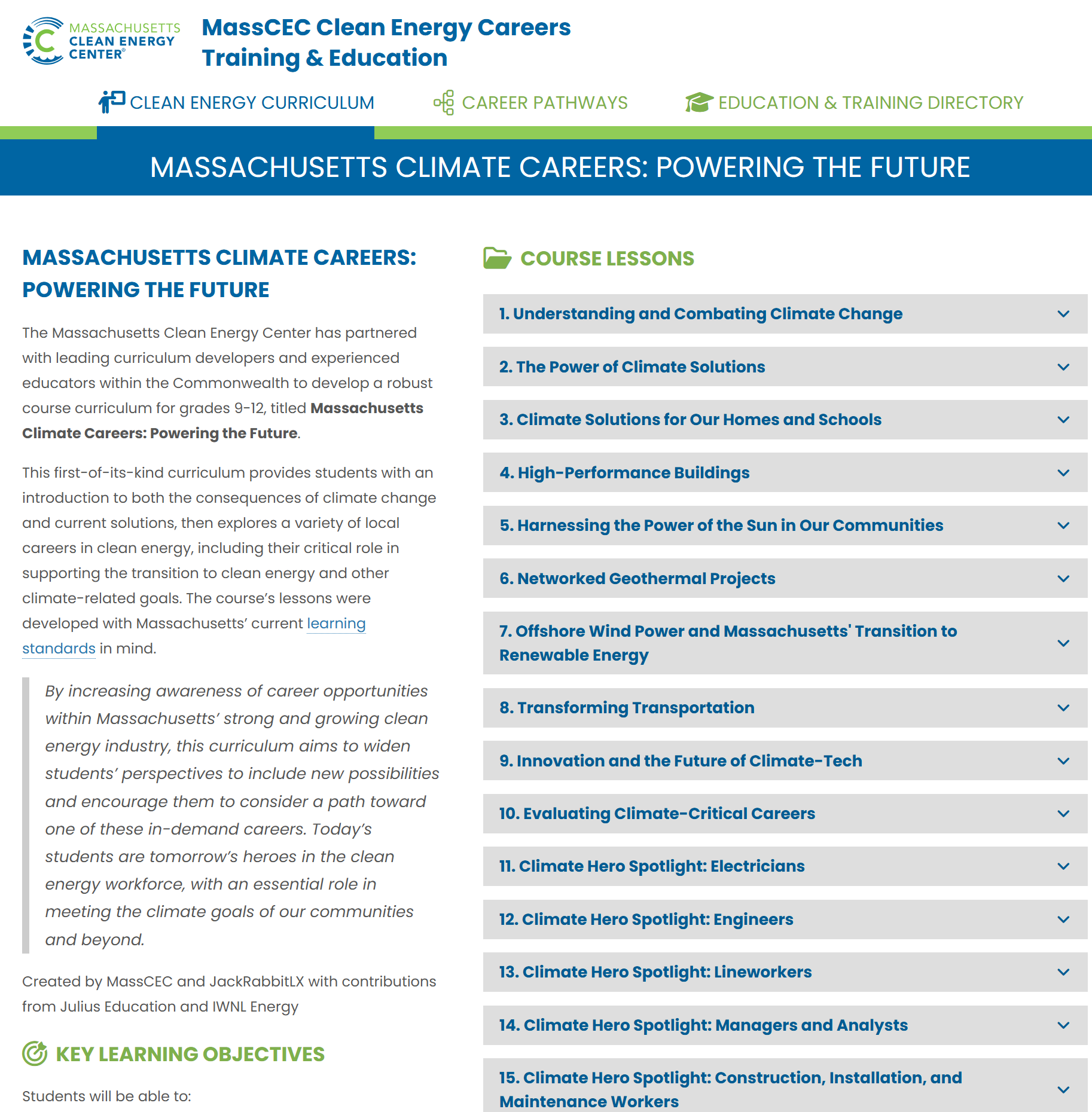 The Massachusetts Clean Energy Center has partnered with leading curriculum developers and experienced educators within the Commonwealth to develop a robust course curriculum for grades 9-12, titled Massachusetts Climate Careers: Powering the Future.